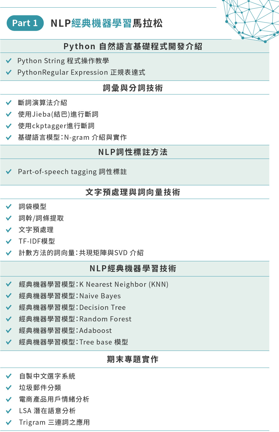 - Part 1 :著重於 NLP 的基礎知識與 NLP 經典機器學習的重要知識點