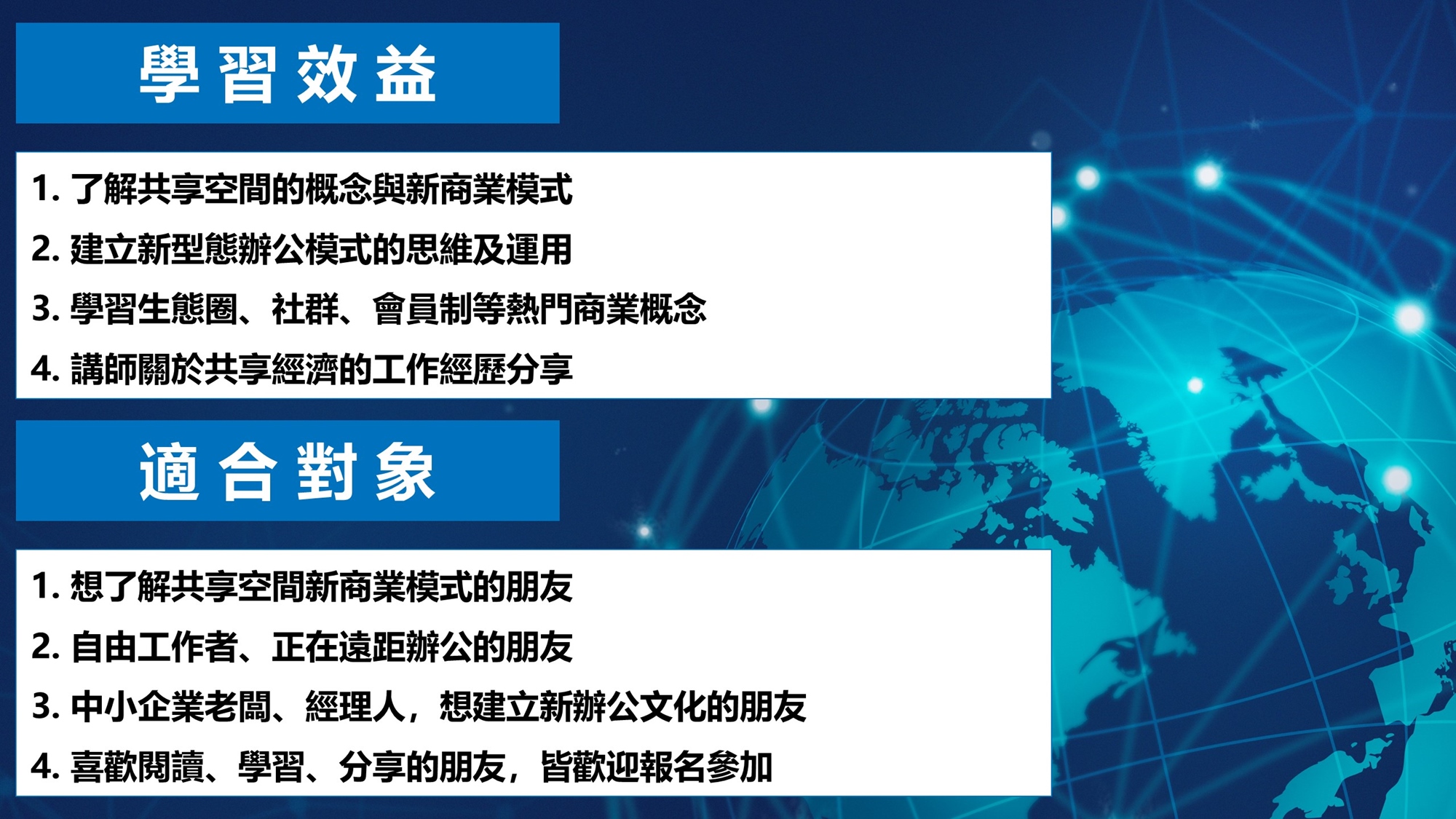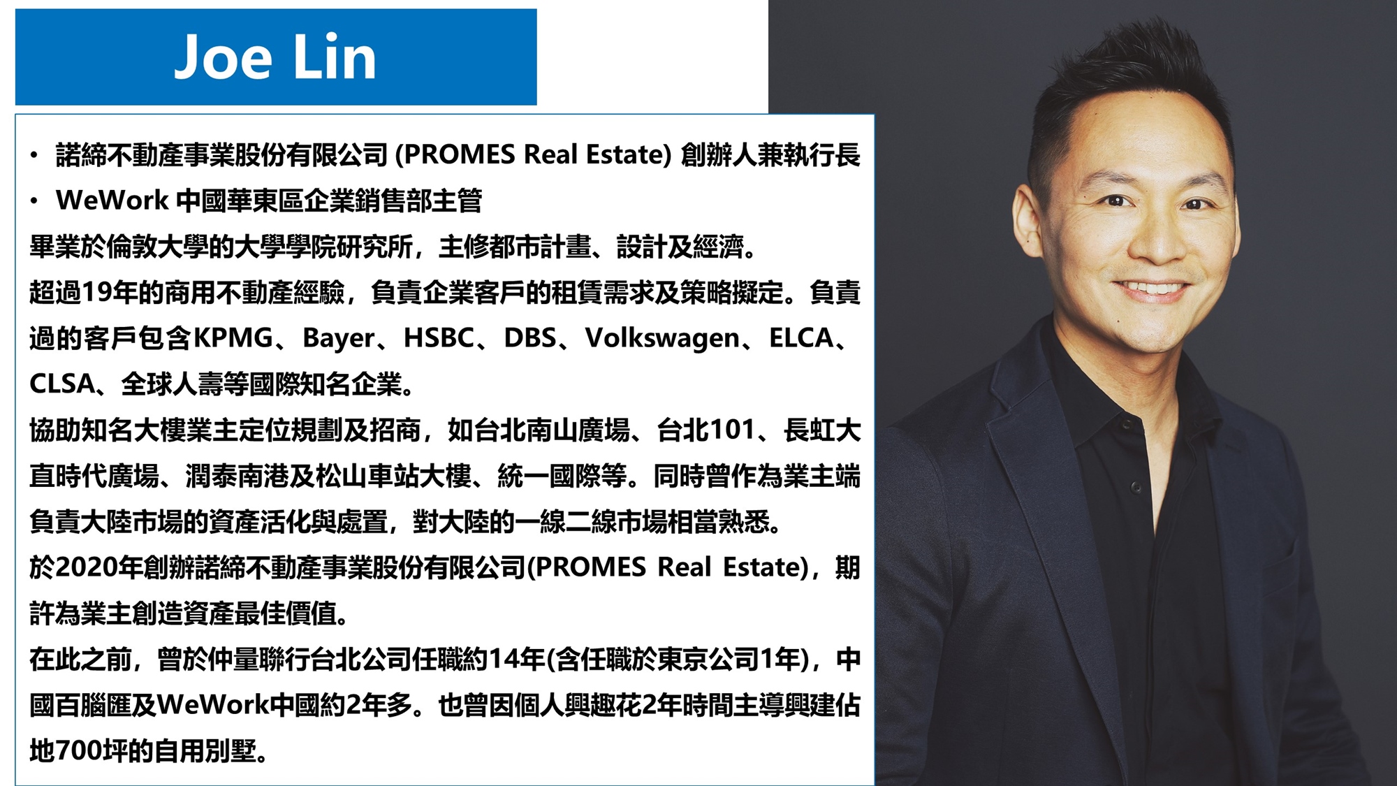 本次講座,邀請到諾締不動產事業創辦人─Joe,曾任「WeWork」中國華東區企業銷售部主管,將與我們分享共享空間的新商業模式與其產業應用!