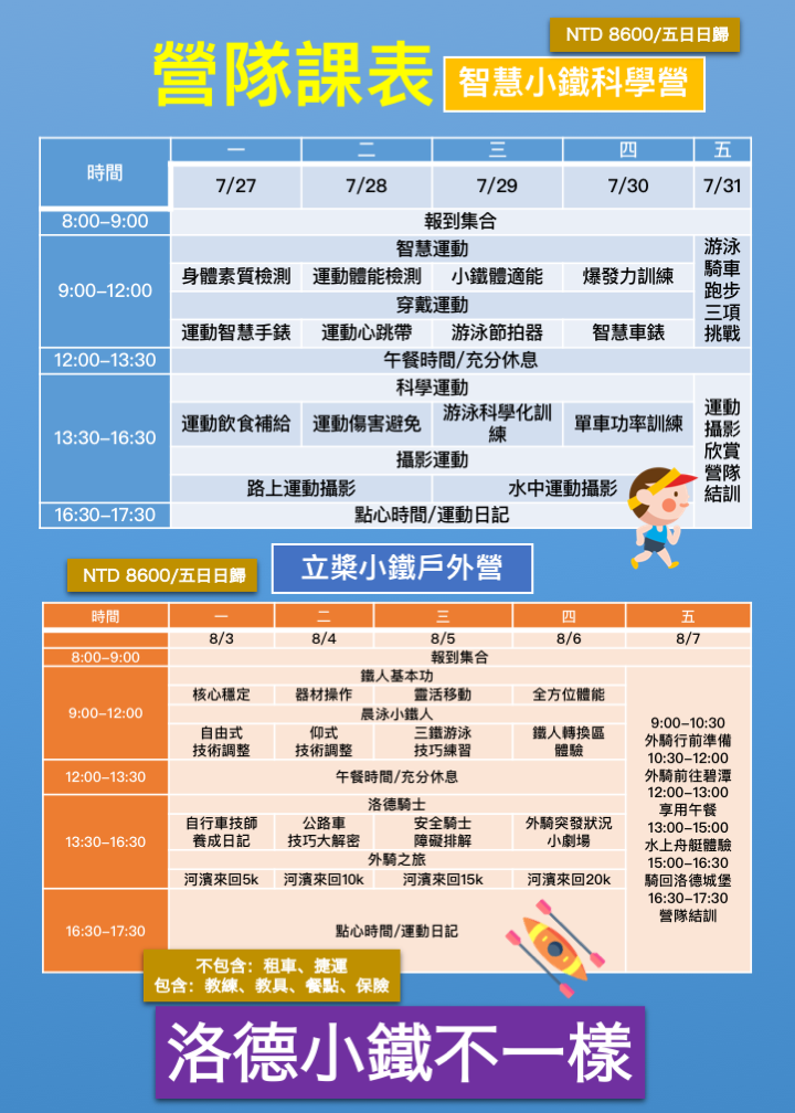 - 精實鐵人三日營:跟著選手一起練,從作息與態度養成小鐵人。