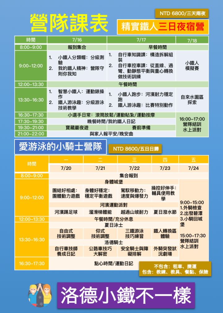 - 愛游泳的小騎士營隊:重點加強游泳與自行車技術,並體驗小鐵人訓練、