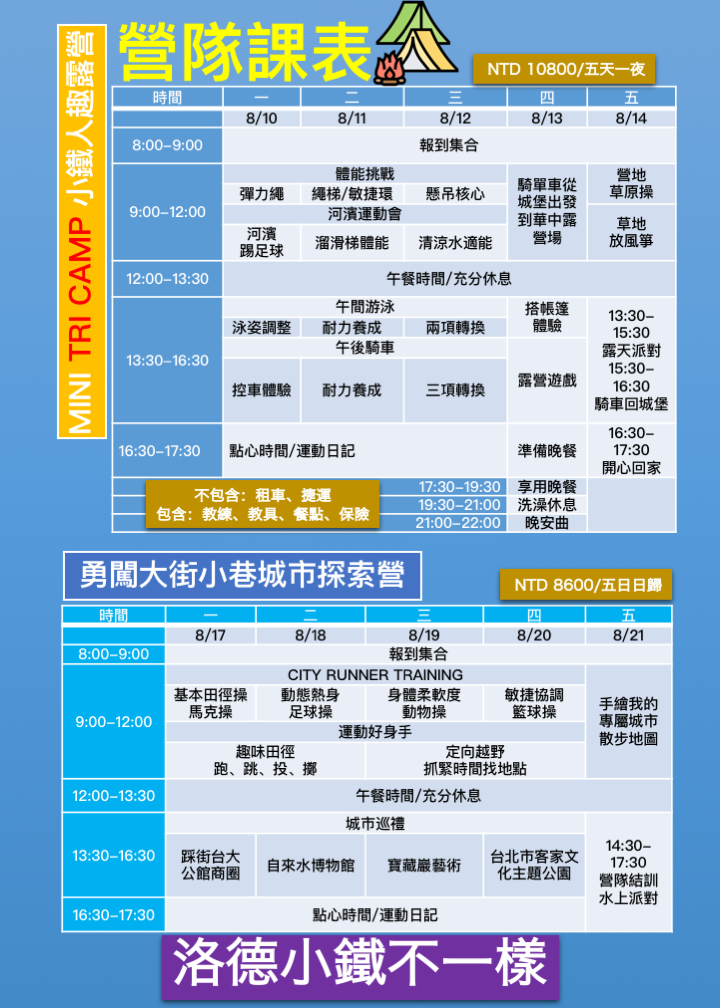 - MINI TRI CAMP 小鐵人趣露營:養成戶外冒險精神與鐵人體驗。