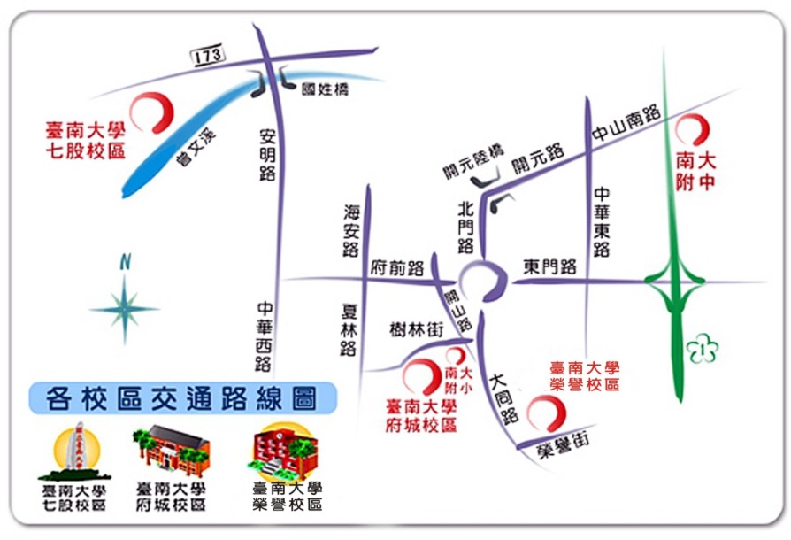 臺南大學府城校區:位於臺南市中西區樹林街二段33號,可由開山路或南門路接樹林街,即可到達。