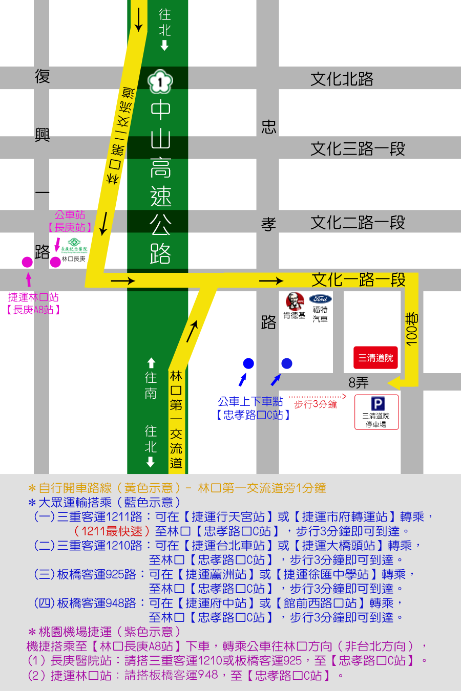 甲.未開車:建議方式搭乘捷運至行天宮站,於行天宮門口左側公車站牌,搭乘「三重客運1211線」(1211A也可),至「林口忠孝路口C站」下車,再步行約2分鐘即可到達。註:行天宮站-》林口忠孝路口C站,客運乘坐時間約20分鐘。
