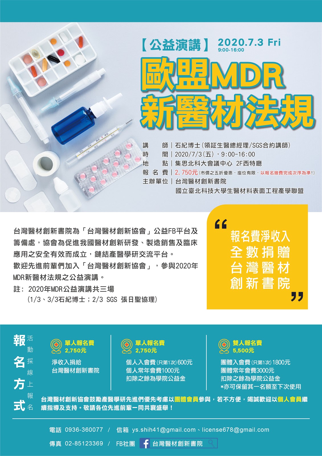 註: 2020年MDR公益演講共三場 (1/3、3/3石紀博士;2/3 SGS 張日聖協理)