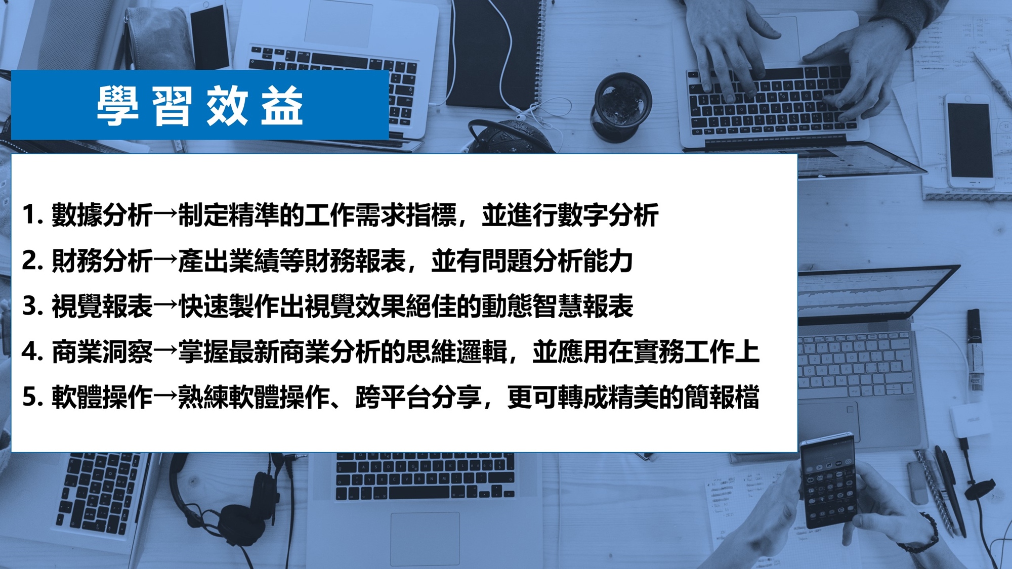和外面開的純工具操作的課程不同的是,我們除了工具的使用教學外,更著重數據化分析的邏輯與流程,及如何以財務角度來做商業洞察與策略擬定。