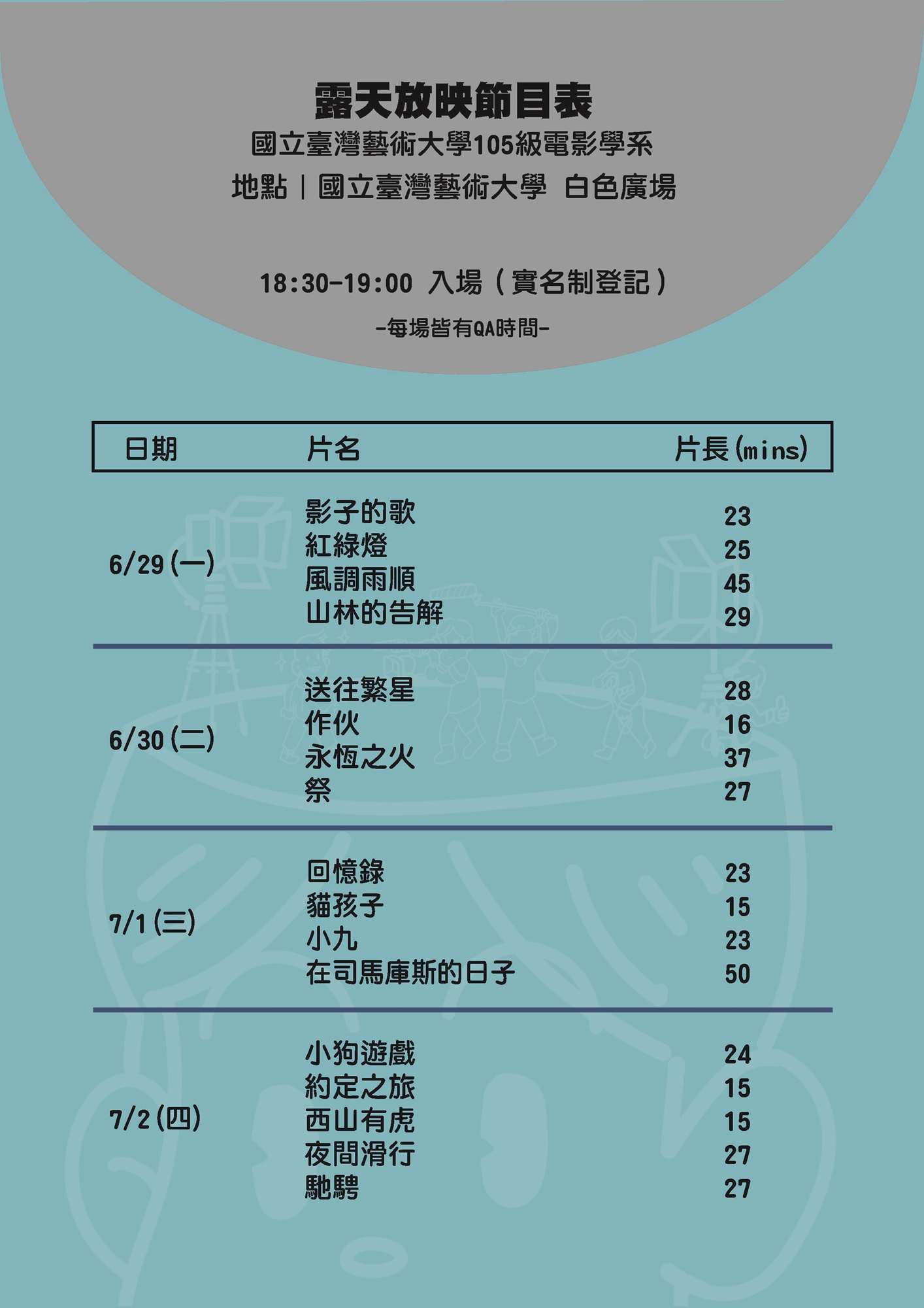 露天放映:2020/6/29 (一) - 2020/7/2 (四) 臺藝大白色廣場