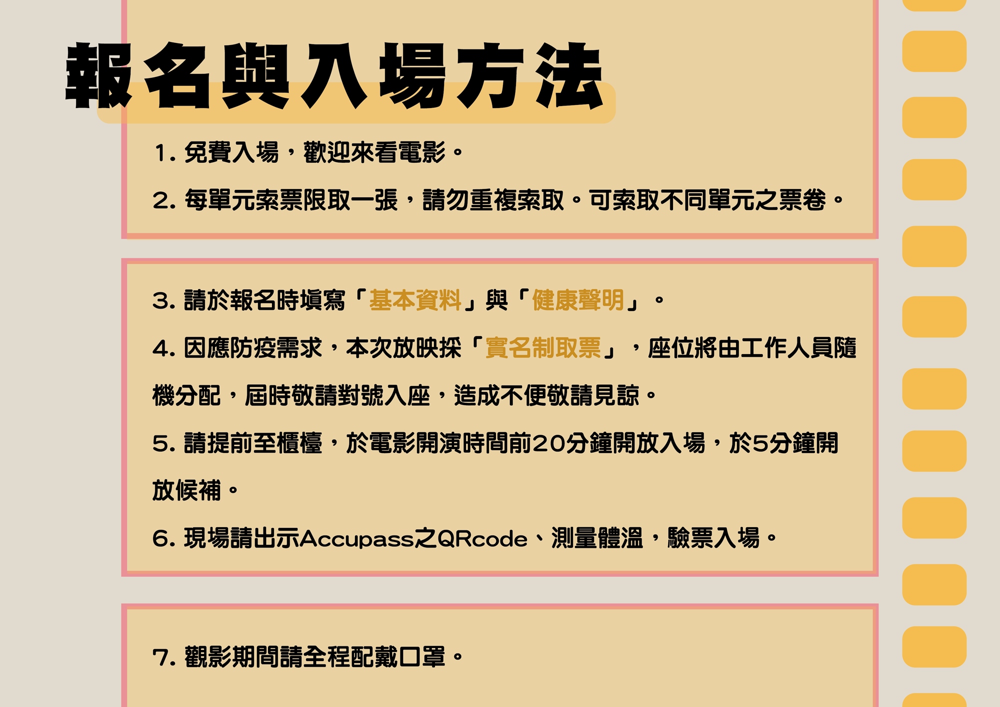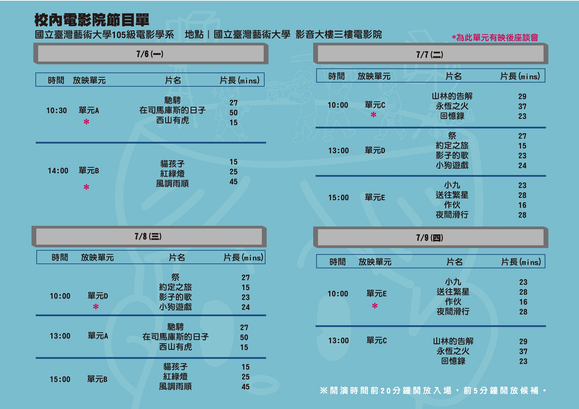 校內電影院:2020/7/6(一) - 2020/7/9 (四) 臺藝大影音大樓3F電影院