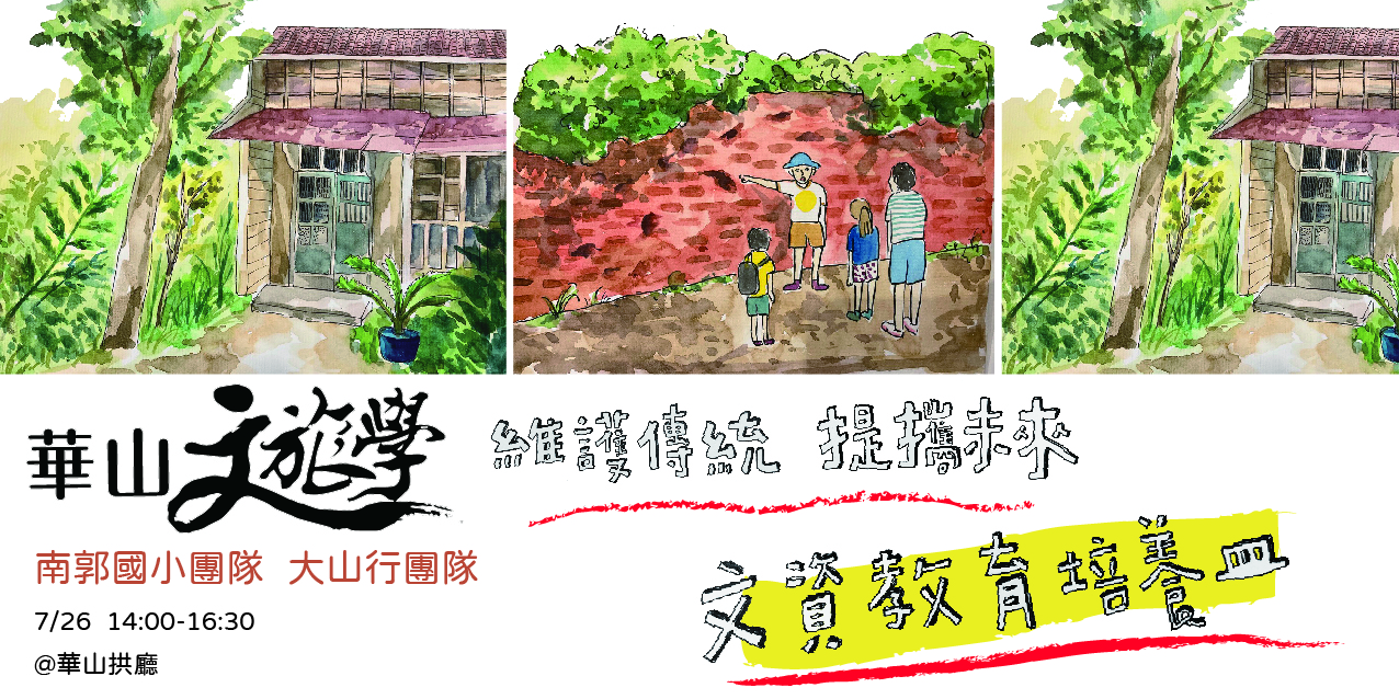 兩位老師如何透過課程進行在地歷史爬梳?大山行團隊又是如何擔任產學連結的橋樑,這個月的華山文旅學將讓老師、孩子與藝術團隊來與大家分享,他們在南郭郡守官舍群裡學到的事情。