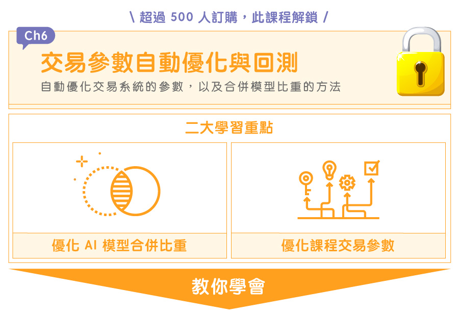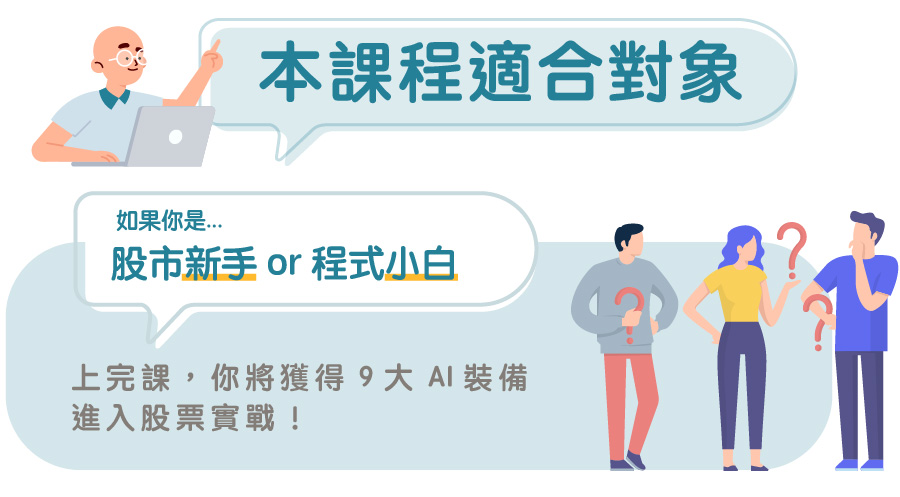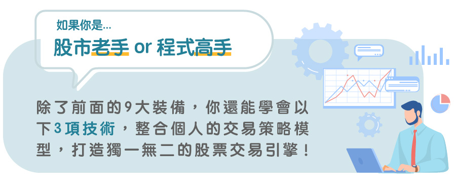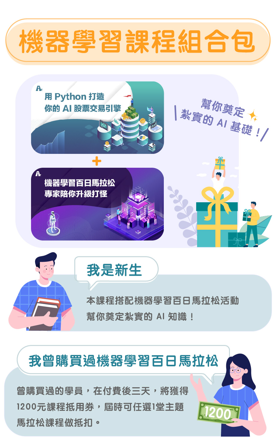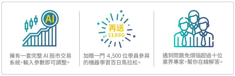 對於想應用 AI 技術於股票交易程式的同學,本課程超值加贈🎁 熱銷突破4,500人的「機器學習百日馬拉松」(價值$ 1,990),帶你學習 AI 底層知識。當你具備了紮實的機器學習基礎知識,將能更全面地打造與調校專屬個人的股票現金製造機。