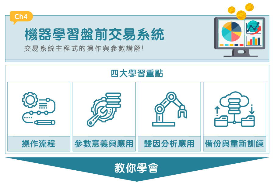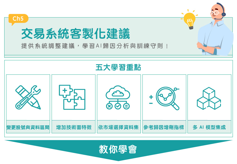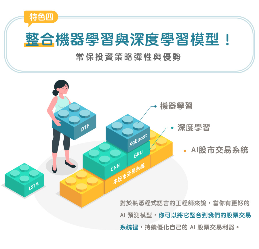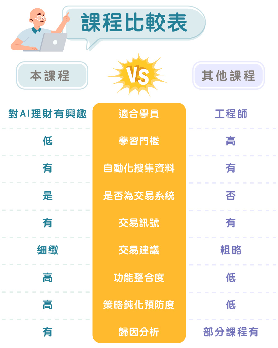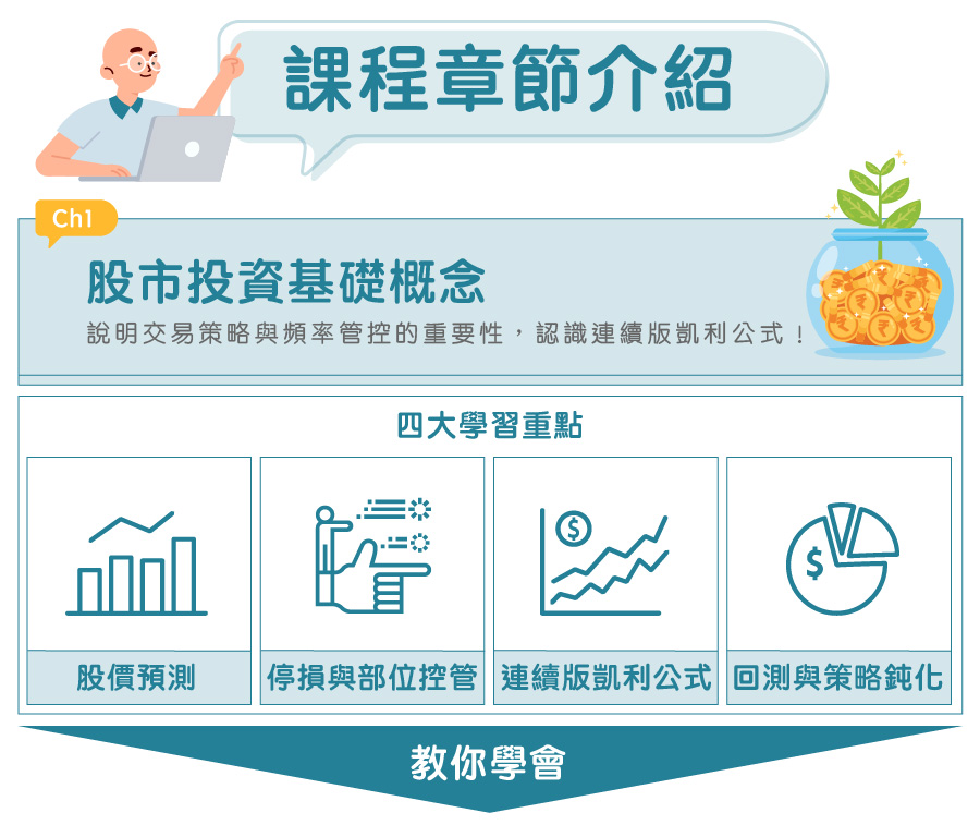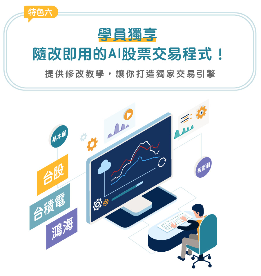 不用程式基礎,也能聽懂的 AI 投資交易課!本課程採實務導向,內建的 AI 股票交易模版引擎,是講師累積多年的 AI 教學與股市操作結晶,學員安裝後,可依照自己的投資偏好與關注指標進行系統設定,將自己的投資策略與 AI 算法結合,打造你的獨家 AI 股票交易引擎。