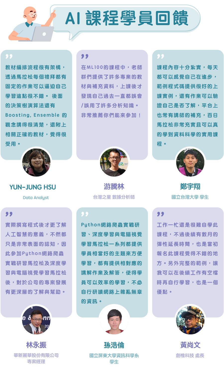 擁有機器學習百日馬拉松的 AI 基礎實作經驗,將成為學員學習進階課程的基石,幫助你繼續拓展更多 AI 知識領域,完善並豐富個人 AI 學習藍圖。