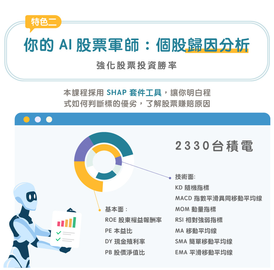 想成為股市交易的常勝軍,必需先從底層了解股票賺賠原因,本課程採用 SHAP 套件提供直觀的圖示,讓你明白程式如何判斷標的優劣,當面對不合理的歸因判斷時,你只需移除該特徵並新增合適的因素,就能持續高效地優化你的交易策略。