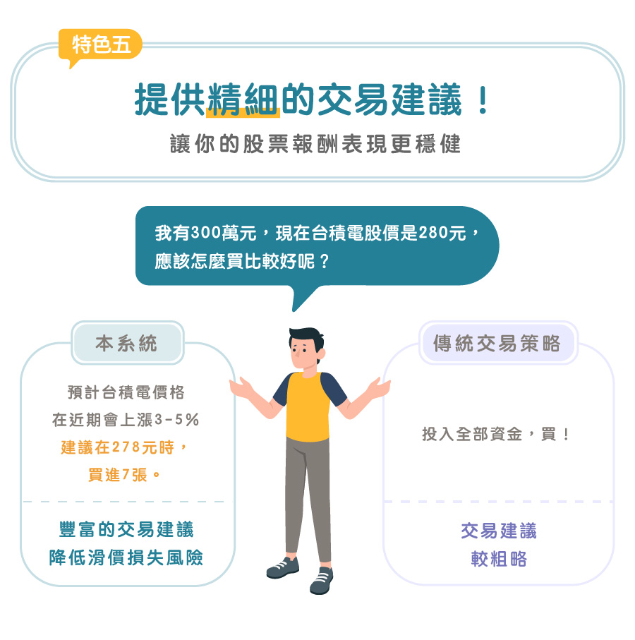 4. 採用 AI 算法提供精細買賣價、張數等建議,提升你的交易決策品質,有效節省您大量看盤的時間。