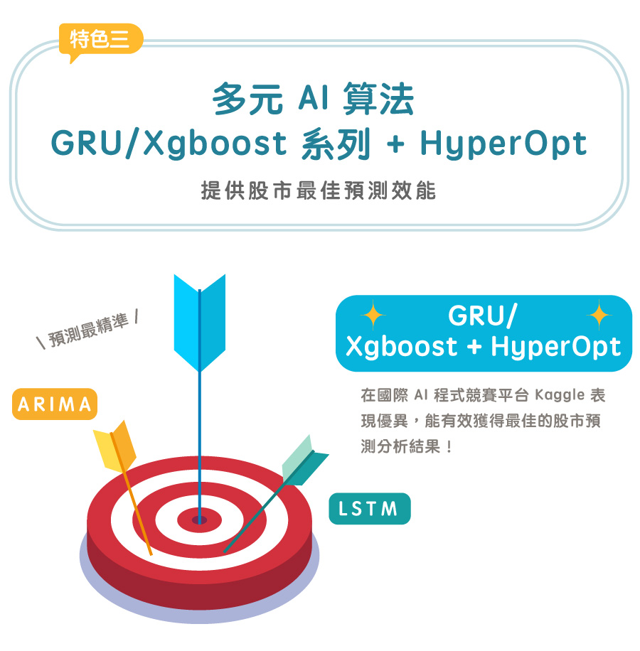 在機器學習預測模型中,Xgboost 的運算準確度表現突出,再搭配 HyperOpt 進行參數調整,不僅有效縮短預測時間,也讓每次的參數效果都比上次的選擇更精準。GRU 與 Xgboots 演算法在國際 AI 程式競賽平台 Kaggle 表現優異,能有效獲得最佳的股市預測分析。