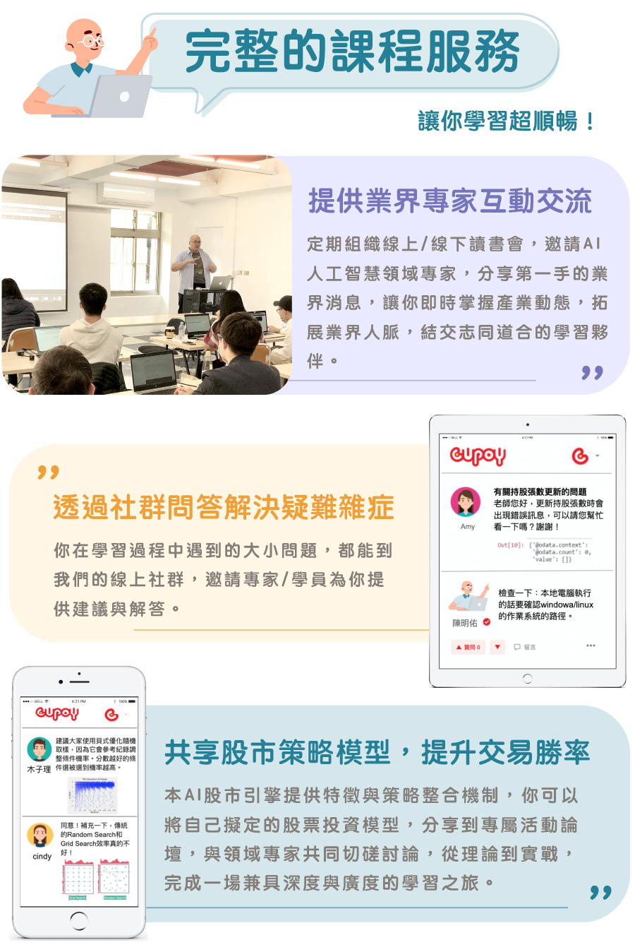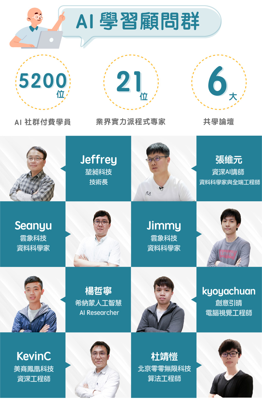 參與本 AI 股市課程,不僅能得到陳明佑老師專業指導,更有多位 AI 業界領域專家在你的學習路上為你解答疑惑,讓你得到最佳學習成效。