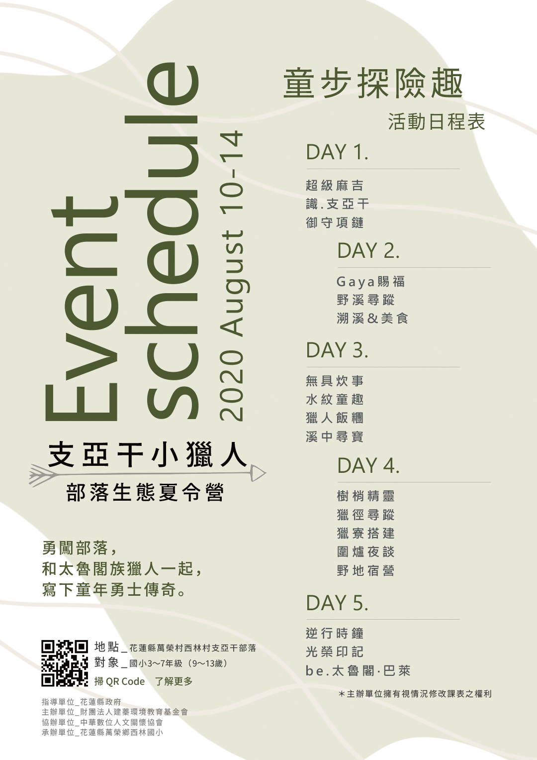 神秘的西西利鳥邀請您,一同進入美麗的花東縱谷北端,循著猶如大樹洞般的支亞干溪往上,探尋此處的河階台地與山林。透過西西利鳥的占卜之眼,和太魯閣族傳統獵人們踏入原始的山林獵場,學習獵人野外生存的技能。通過五天四夜考驗的小勇士們,成為被祝福的太魯閣族小獵人,將獲得榮譽太魯閣族族人榮譽證書,並由耆老賦予個人專屬的太魯閣族族名,蛻變為真正的太魯閣族的支亞干小獵人。