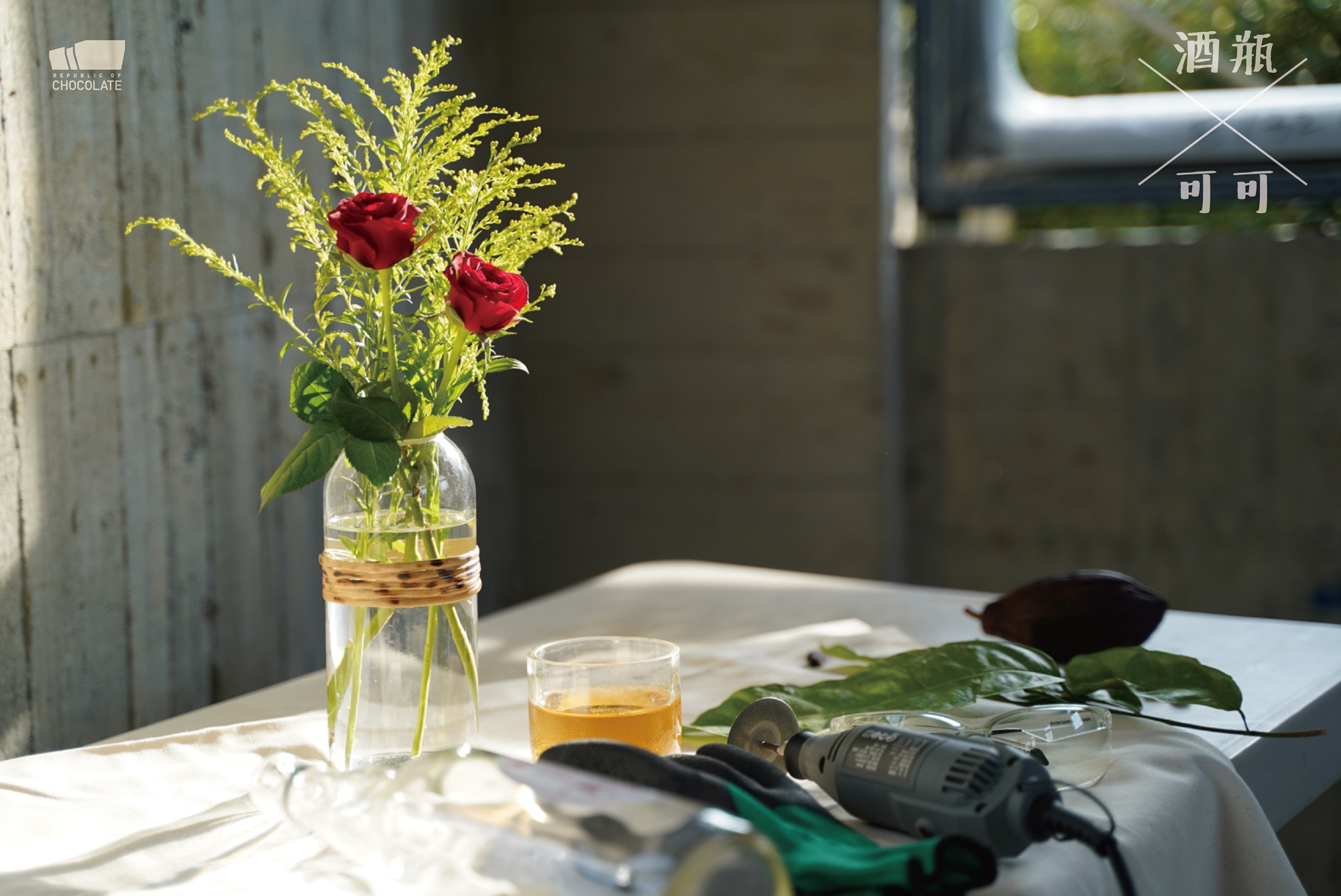 將製成酒糖所產生之廢棄空酒瓶,透過職人熟捻的技巧,以複合媒材手法將「可可」結合「酒瓶」,製成日常生活中的藝術品:如手沖可可座、可可果莢吊燈,讓藝術品進入到日常。