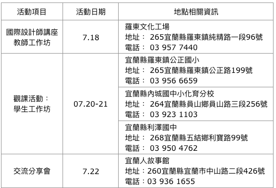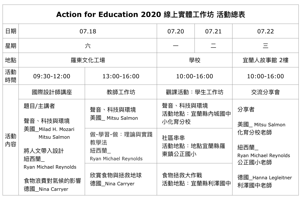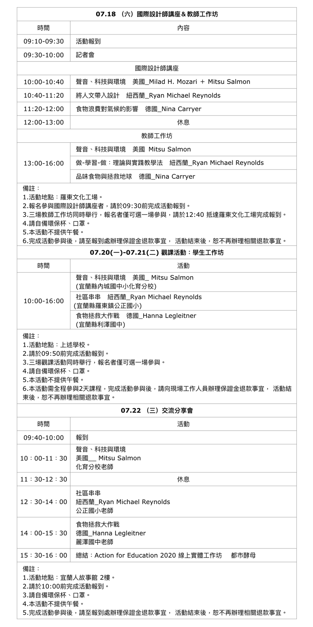 活動將於7.18至7.22展開,包含國際設計師講座、教師工作坊、學生工作坊觀課與交流分享會,所有活動都歡迎關心教育的朋友們一起參與。