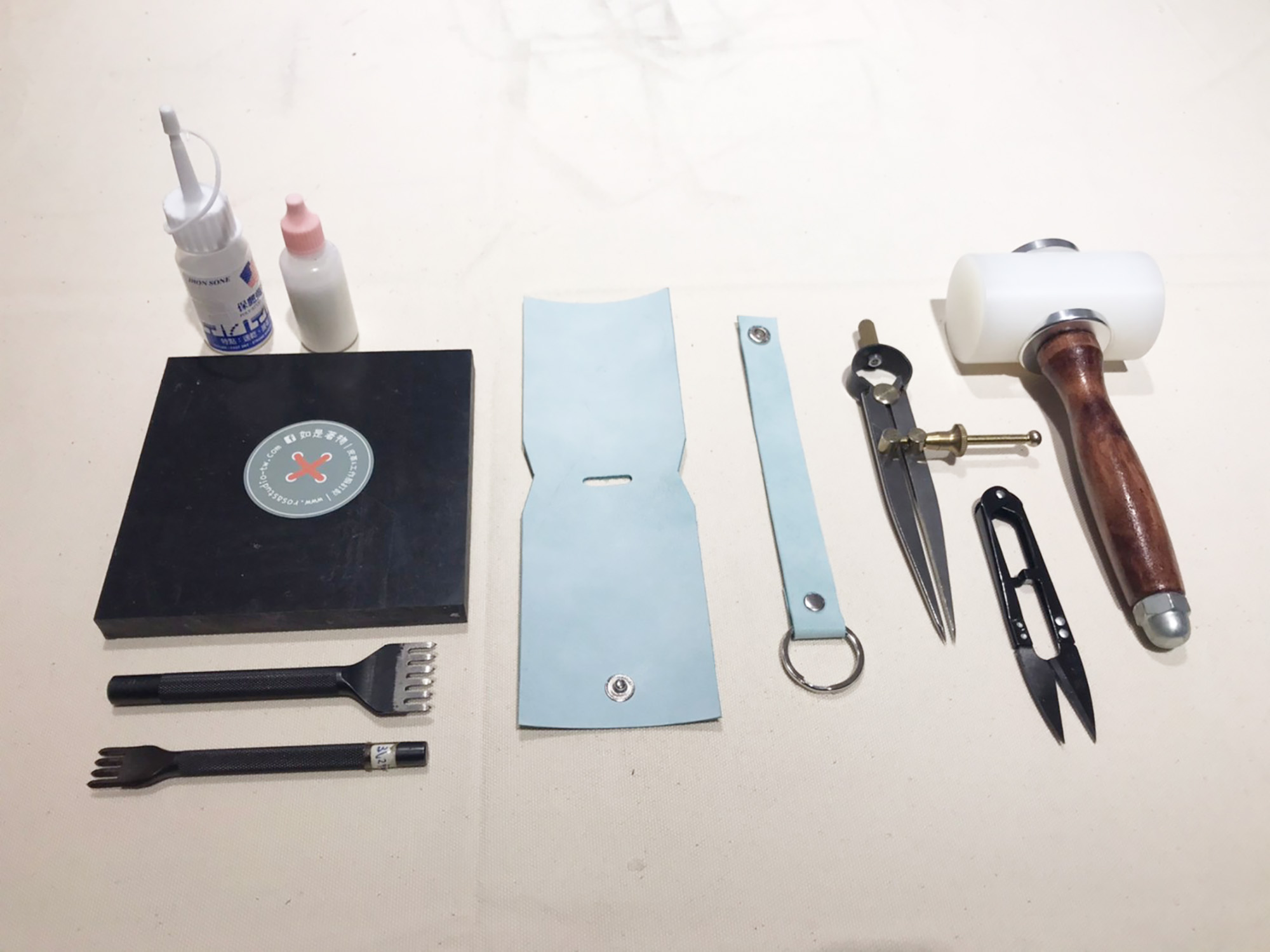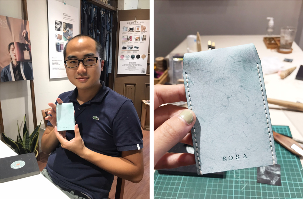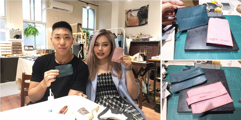 製作流程:敲印文字、皮革打孔、縫製、塗邊、上蠟保養完成。