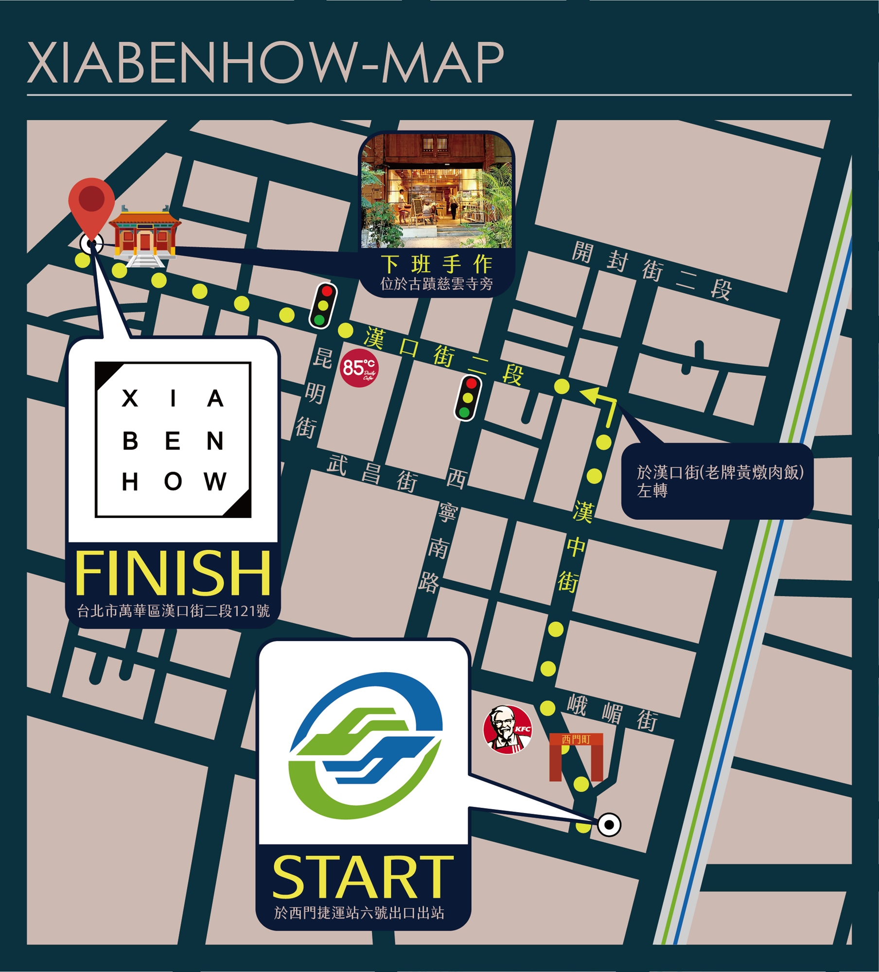 ・交通:捷運搭乘至「西門捷運站」6號出口,右轉漢中街走4分鐘,遇到漢口街二段左轉直走5分鐘即達。位於「古蹟慈雲寺旁」