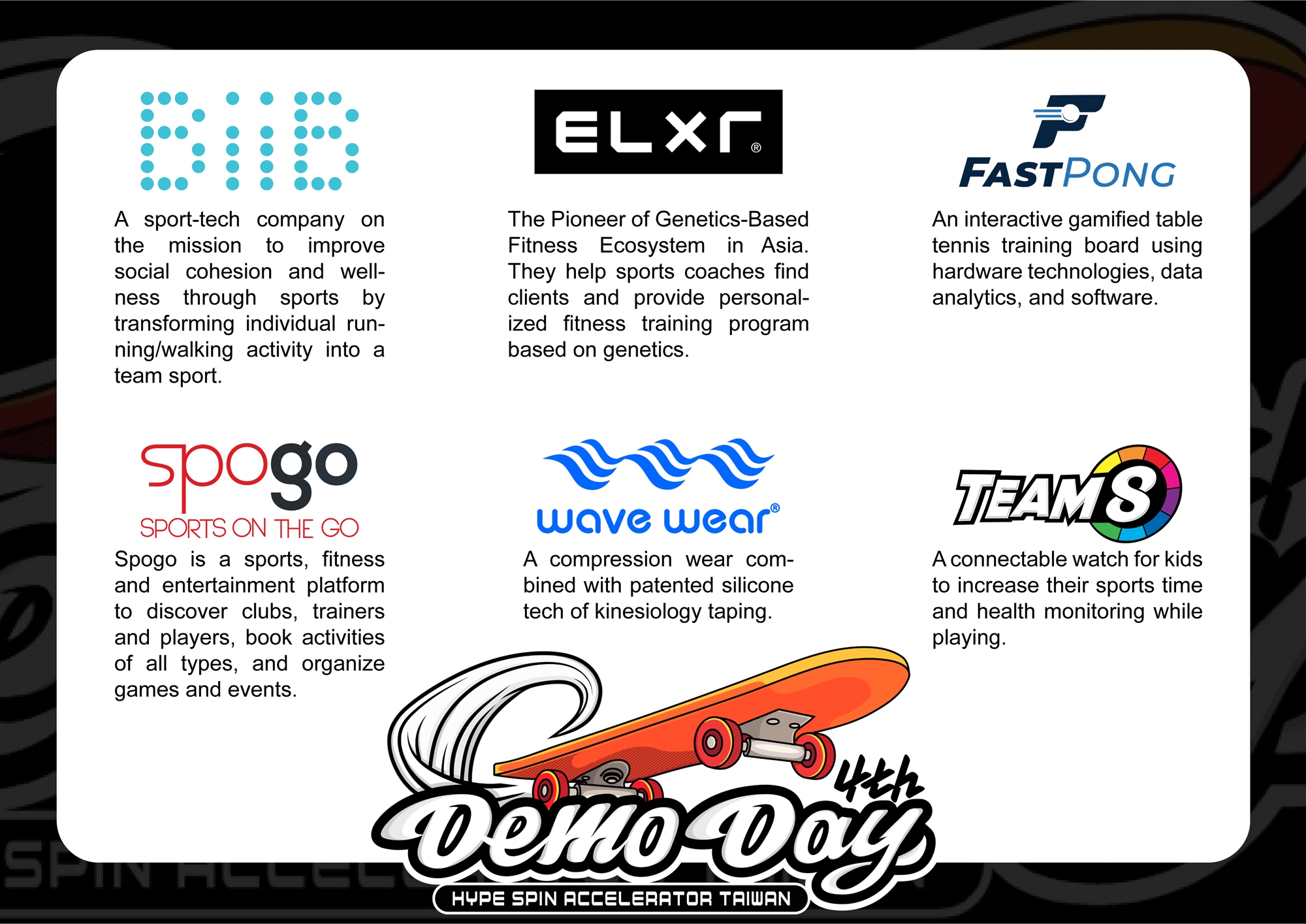 HYPE SPIN Accelerator Taiwan is the first and biggest sports innovation ecosystem in Asia, and with support from the Sports Administration of the Ministry of Education, our vision is to be the Asia Hub for Sports Innovation.
