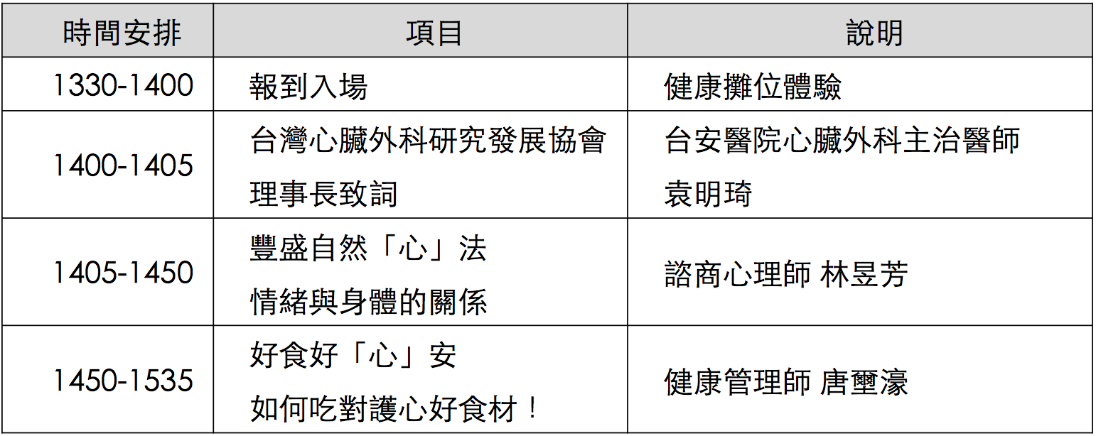 因此,台灣心臟外科研究發展協會於今年推出免費公益講座,邀請到專業諮商心理師 林昱芳與尚唐坊創辦人暨健康管理師 唐璽濠,還與民眾分享如何在日常,學會關注情緒保養,以及透過飲食保健,為身體提供良好的能量儲存。