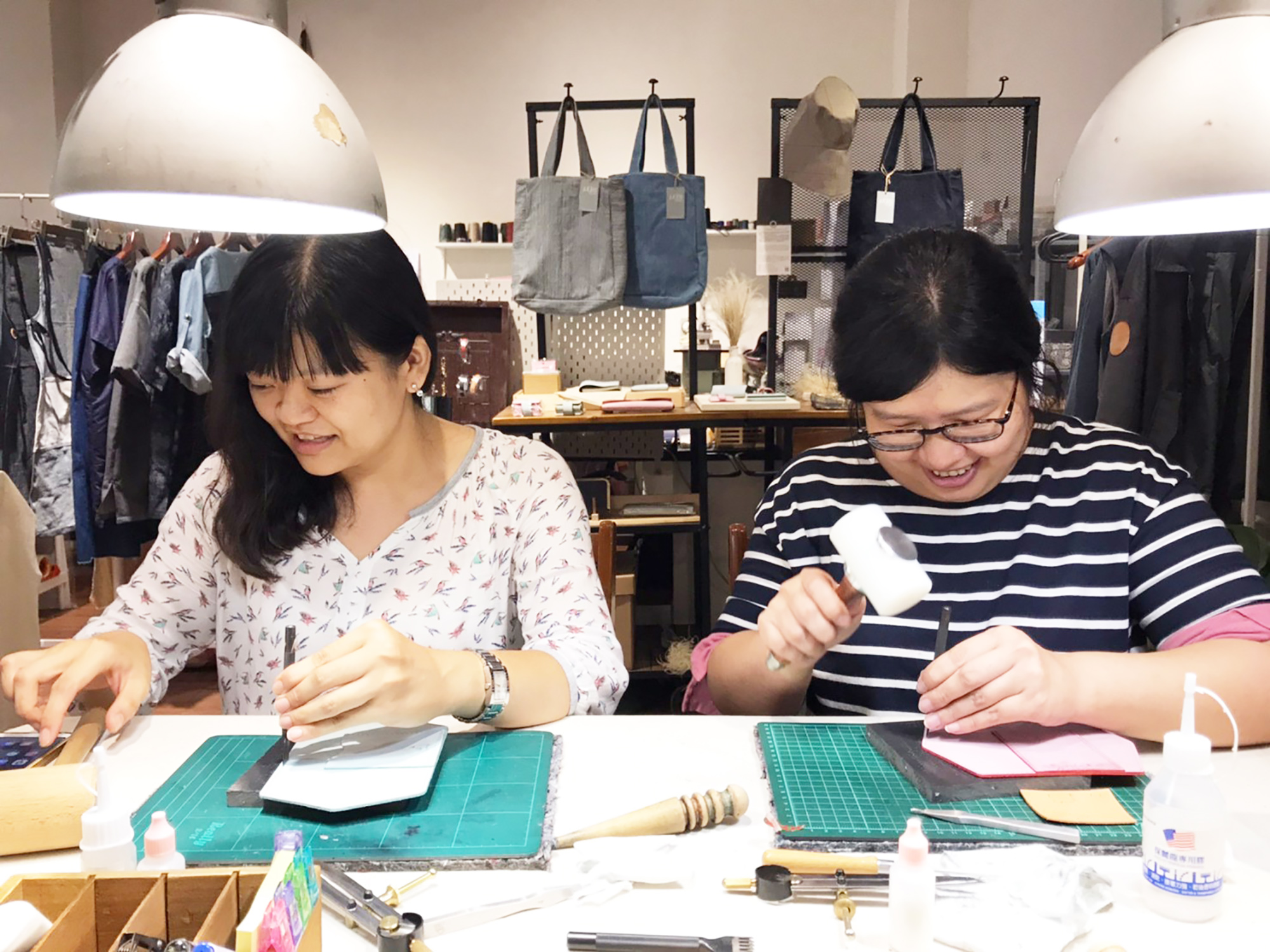 製作流程:敲印文字、皮革打孔、縫製、塗邊、上蠟保養完成。