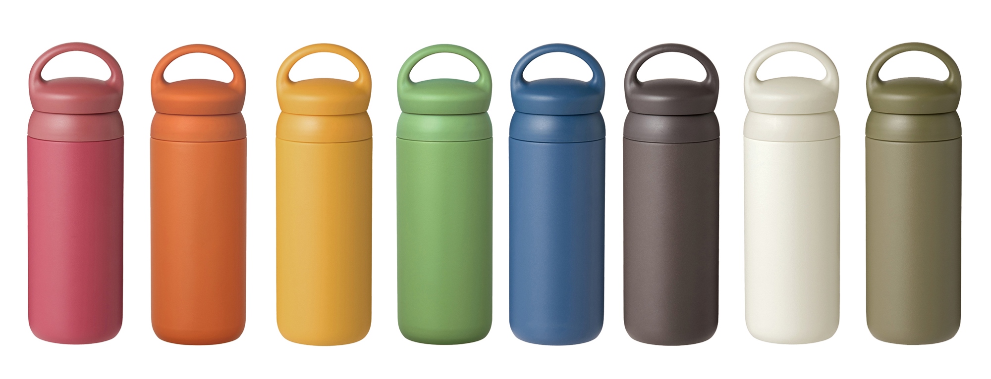 (DAY OFF TUMBLER保溫瓶,由左至右為:莓果紅/橘/芥末黃/青草綠/深藍/深灰/白/灰綠)