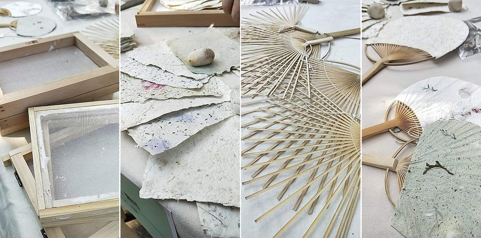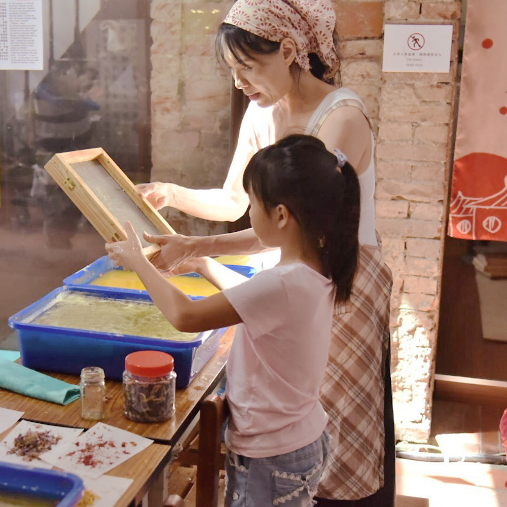 課程中會示範多種製紙的技巧,結合各類青草、植物纖維,讓孩子在團隊中互相學習,一同製作環保的「沁夏草本紙扇」與「手縫自製書」,親手做一份香香療育的草本禮物給爸爸媽媽吧!