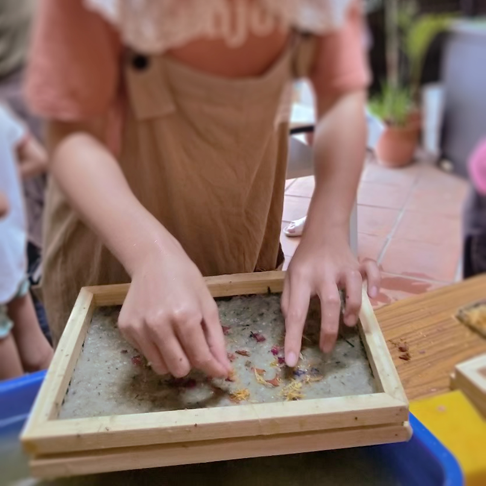 環保紙漿的製作,搭配上午認識的各類青草,讓孩子創作個人風格特色紙張!