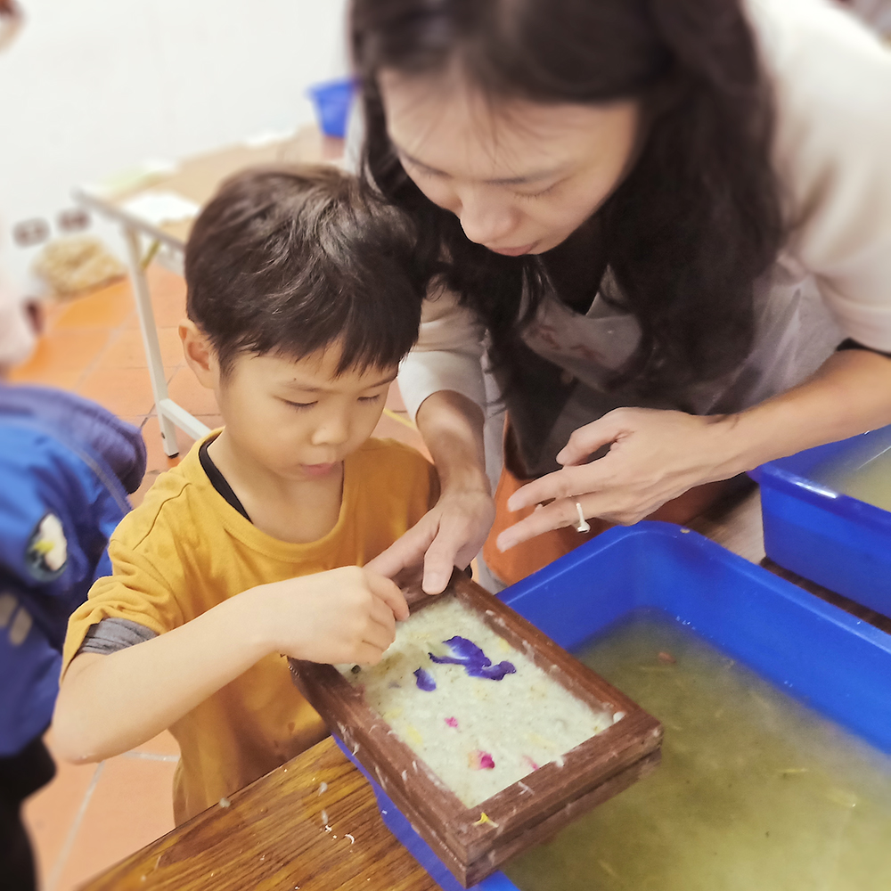 生活中好多乾淨紙漿容器,洗淨後可以再生還原成為有用的材料呢!課程中使用無防腐劑的自製材料與利用回收二度使用的工具,啟發孩子對生活上的愛物惜物概念。