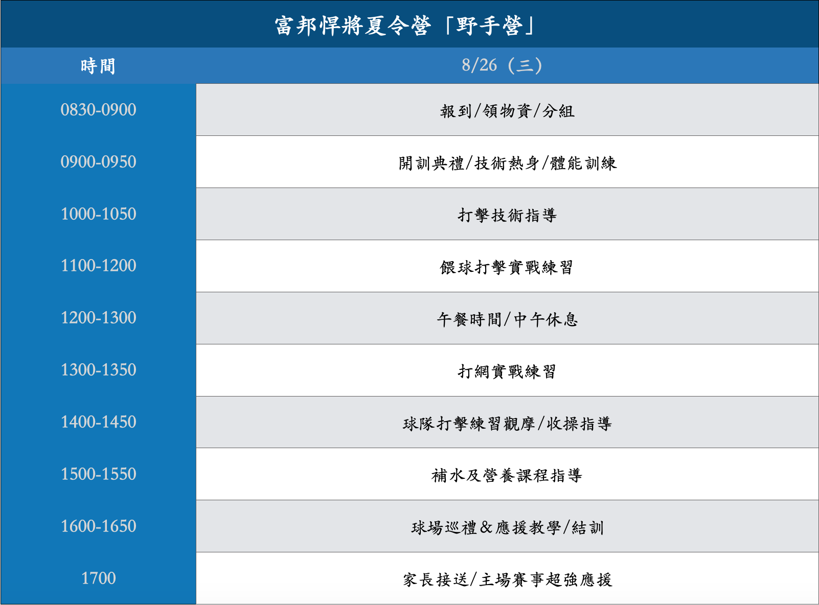 - 報名需填寫家長同意書,請自行列印並E-mail至「Service@chanceinmarketing.com」,標題為「2020富邦悍將棒球夏令營-野手營+姓名」,始完成報名。