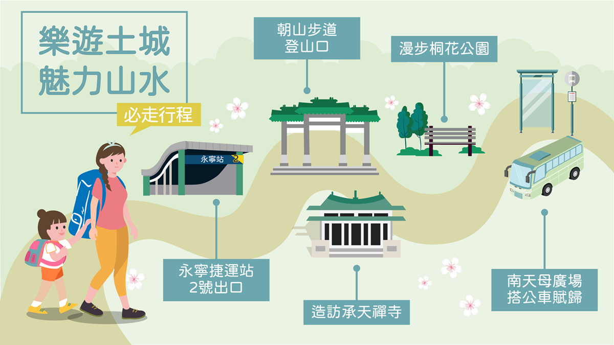 藉由交通發達之便,邀請親子家庭一同順著朝山步道進入大自然美好之中,並探訪著名的承天禪寺,感受古樸幽雅的石板路,舒適平緩,同時在著名的桐花公園進行感官自然體驗,透過觸覺、味覺及嗅覺幫助孩子認識大自然啟發五感。