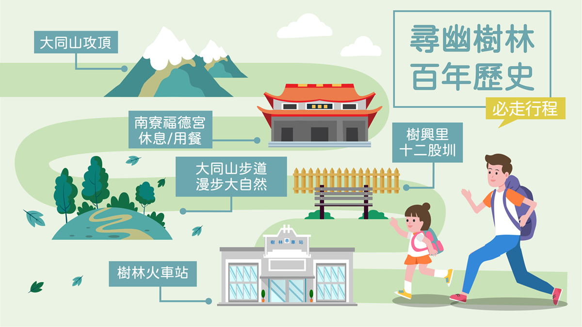 漫步大同山步道,新北百萬美景吸引不少登山客、鐵道迷以及單車愛好者流連忘返,希望邀請親子一同進入樹林區環境與歷史空間之中,因為那不僅是市鎮的地方特色,更是你我共有的在地文化資產,深信在我們擁有現代化、繁榮進步的生活時,同樣也能身處在具有歷史氛圍的空間之中。