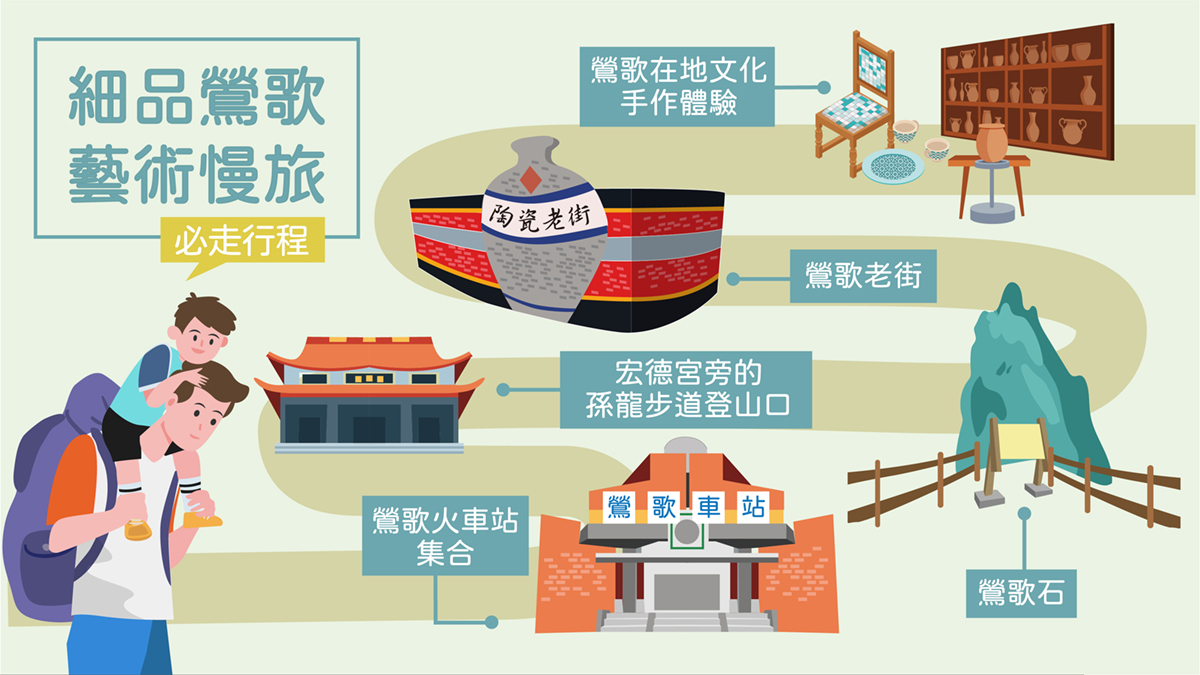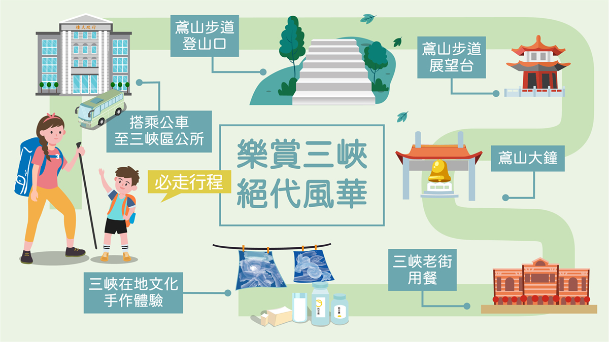 前往旅遊打卡夯點─鳶山步道,雖高度僅有三百多公尺高,卻非常適合親子家庭在假期中遠離塵囂進入山林之中,俯瞰大台北地區的繁榮景緻,走進三峽老街欣賞百年歷史的絕代風華,並體驗在地文創藝術所帶來的樂趣,更幫助孩子對在地文化及土地的認同與珍惜。