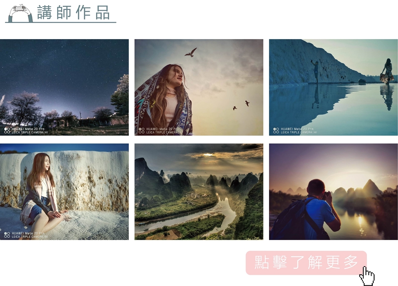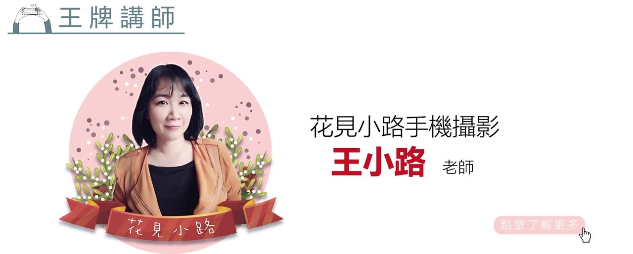 授課講師 特聘講師 / 花見小路手機攝影王小路 老師 / 拍出好照片不再是高階相機的權利,現在用手機也能拍出好照片,記錄你眼前感動的那一瞬間。網路被稱為「手機攝影達人」的小路,專以手機做為拍照工具,是台灣少數以手機做為專業攝影的女性攝影師。