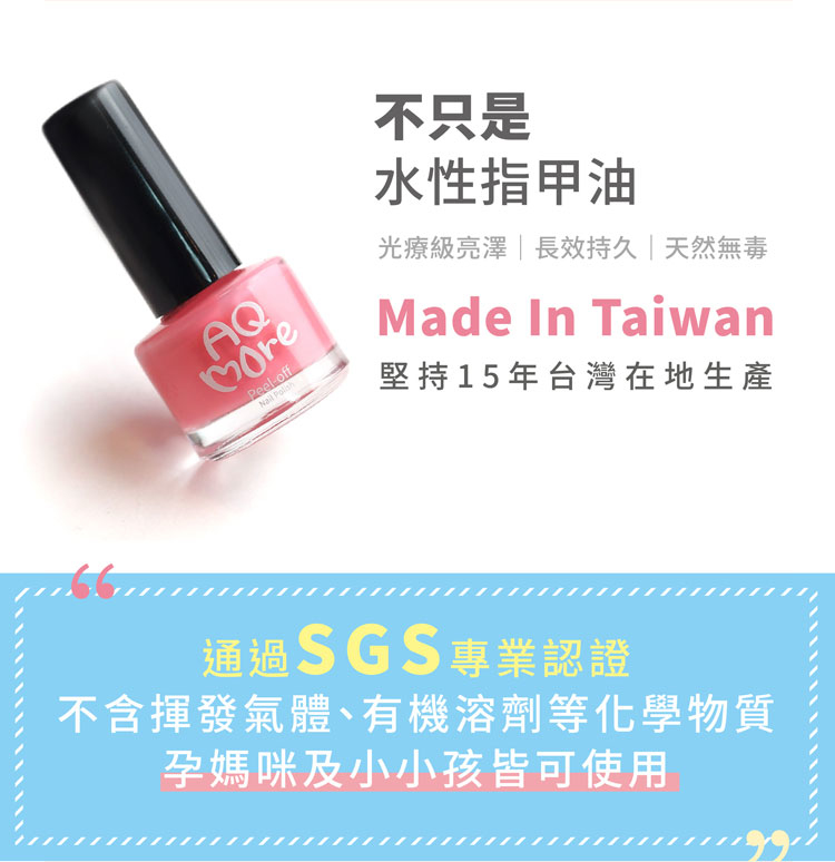 全系列皆為水性成分的指甲水,泡溫水40秒即可剝除。