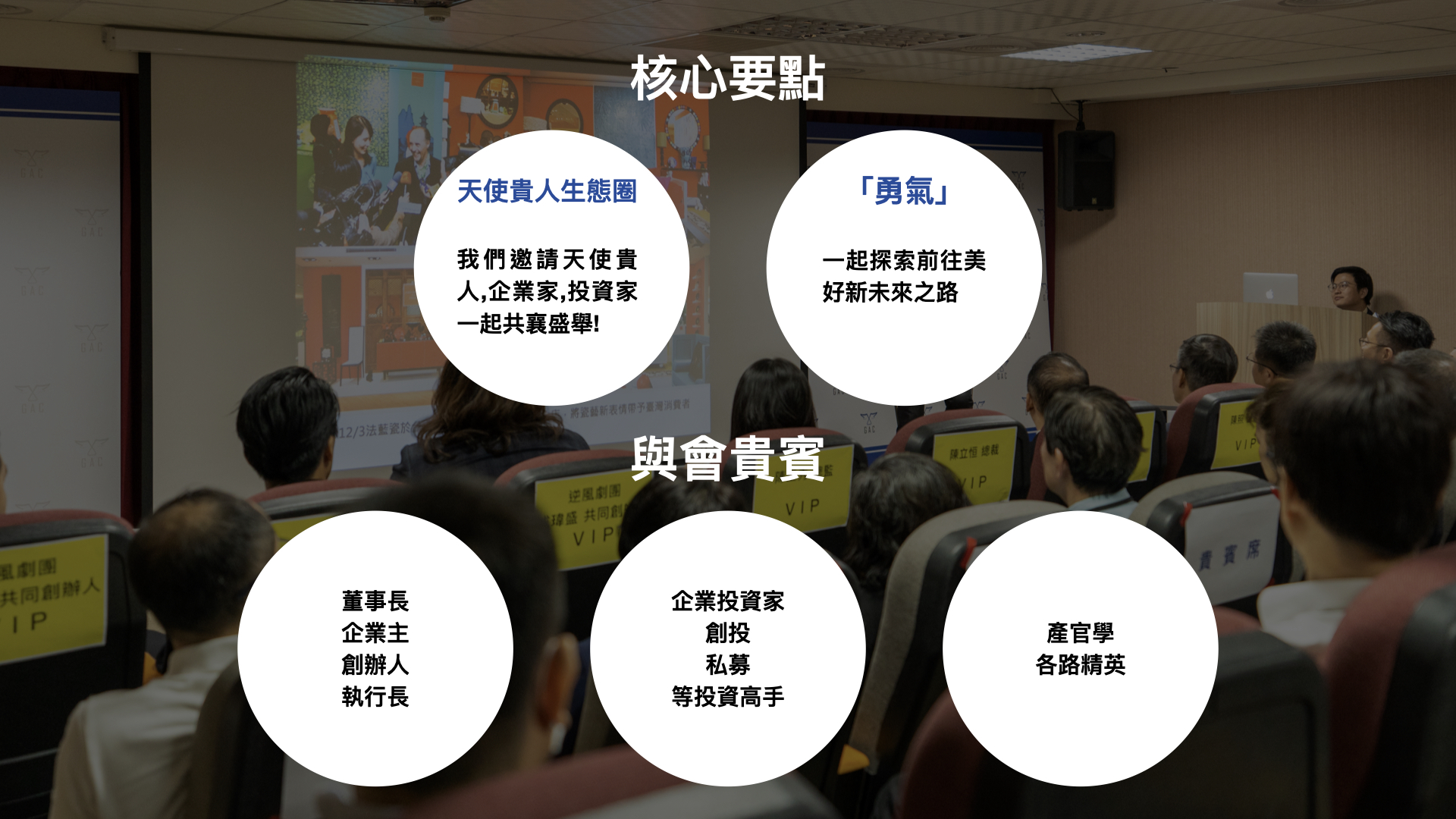 號召天使、產官學研投創各路重大推手以及菁英,共創多贏!