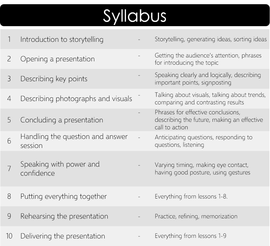 本次課程中除了豐富的閱讀題材讓你複習所學,你也將學習如何將所學真實運用在不同英文情境中。當你能夠試著去配合不同的場合去實際應用,相信在未來的簡報中,你也能輕鬆應付,就算是臨時被邀請在外國朋友的婚禮致詞,也能發揮所學,運用簡單的簡報技巧讓你輕鬆掌握全場氣氛。