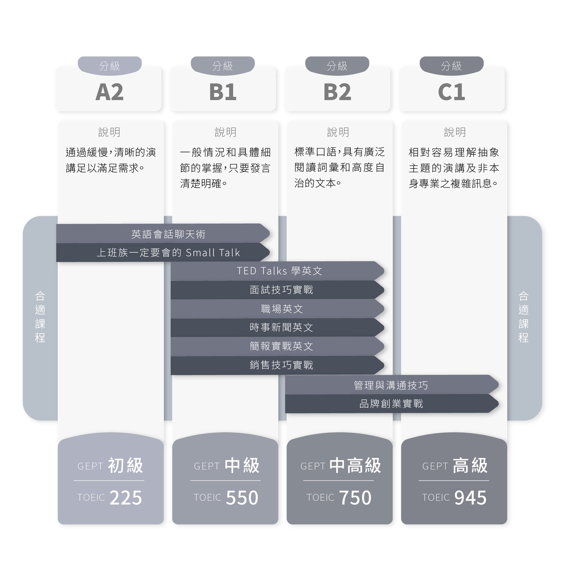 👉每門課皆為 4 人精緻小團班,3 人即可開班授課,同時兼顧團體與各別指導的上課方式,以最有效率的方式強化您的英文口說與策略思考能力。
