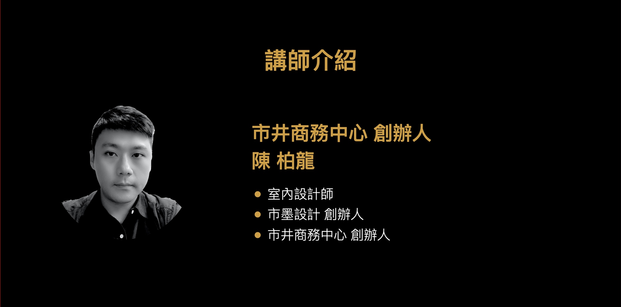 講師 陳柏龍是一名室內設計師,因為事業有成所以現在回過頭來成立商務中心,幫助更多的設計團隊快速成長,本次講座將用以下三個主題來讓大家了解,新創如何運用設計思考,做好股權設計、產品設計,並設計出投資人喜歡的項目😍😍😍 :