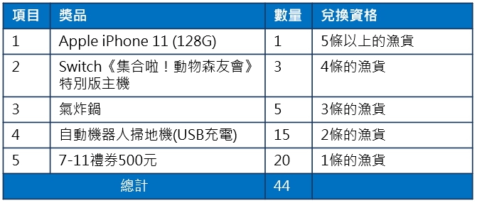 -每組可在任何一時間點進行禮品兌換,禮品兌換後將不回收漁貨但將會放置於休憩區避免重複計算,禮品以限量的方式進行兌換,已先達成兌換資格為主,換完為止。