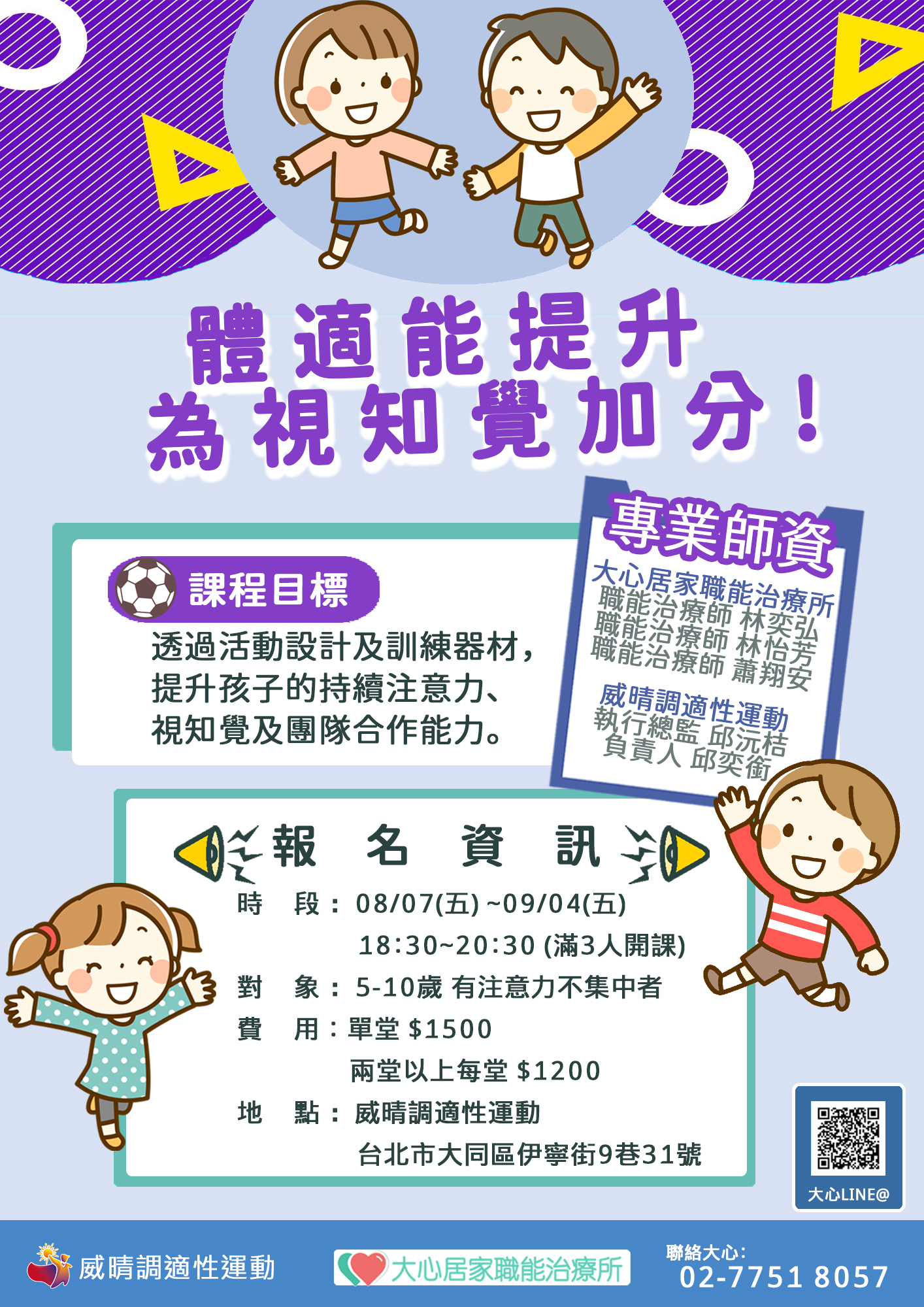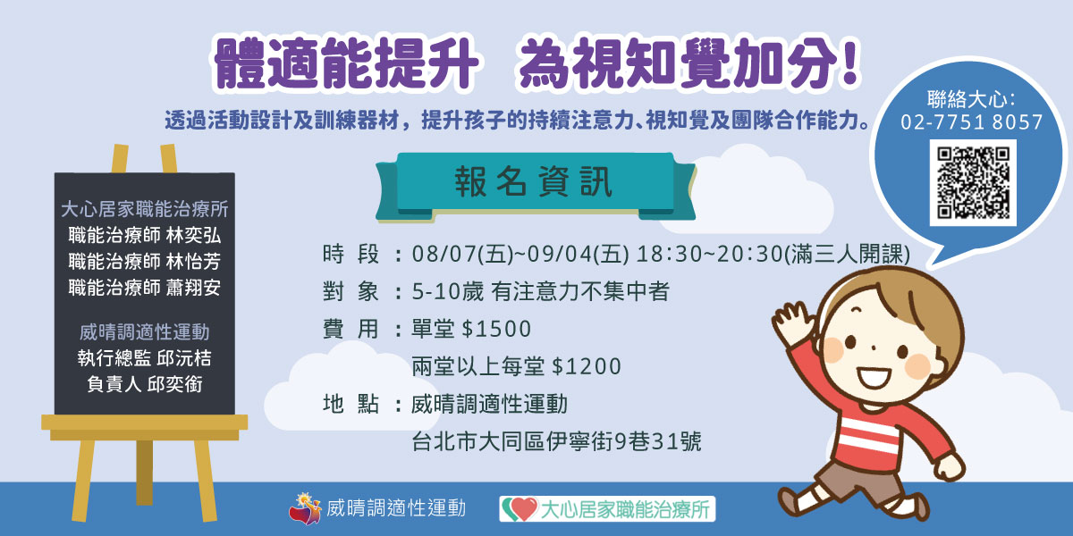此次大心居家職能治療所與威晴調適性運動團隊共同推出一系列的「適應體育-專注力訓練班」課程,讓孩子能透過視知覺及體適能運動中,學習到「持續注意力」、「工具操作」、「挫折忍受度」、「團隊合作」、「視覺區辨與手眼協調」、「空間概念與觀察」六大目標。我們有最專業的器材以及精心設計的教案道具,讓孩子在各個項目都有成長的訓練,歡迎踴躍報名,額滿為止!