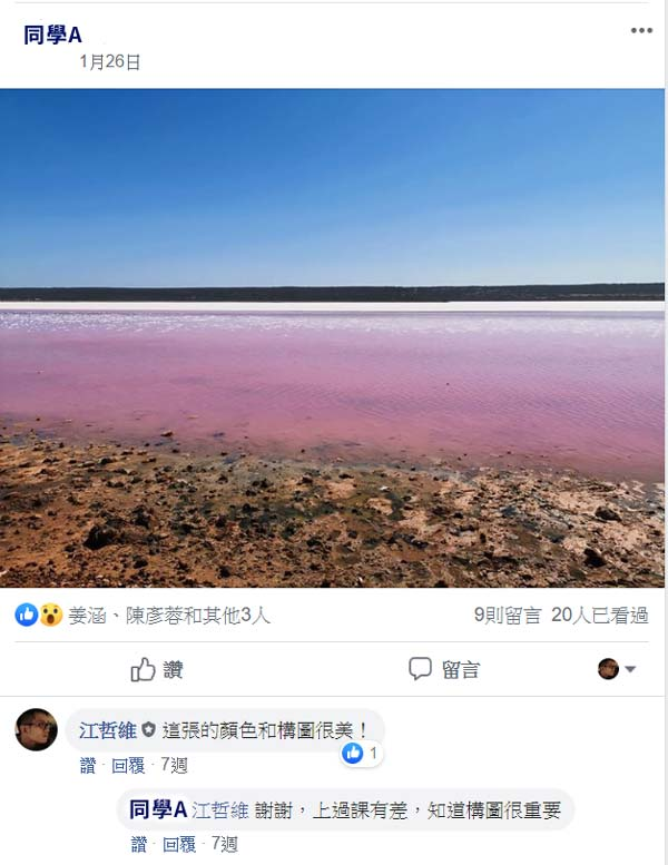 「覺得很不錯,線上學習的方式滿好的。老師會即時回覆留言,彌補了非現場的互動性。老師上課方式不無聊很生動,上課的時候會笑很開心,並且能加入FB社團,老師會回應學生的作品,很棒!」