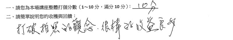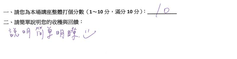 「覺得很不錯!課程內容蠻實用的,自己是個剛入門的人,老師上課方式讓自己很容易入手,不會有太多專業術語,有吸收到東西。會給10分!」