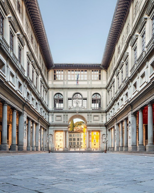 烏菲茲美術館位於義大利佛羅倫斯,這座城市是文藝復興的發源地,在15世紀是全歐洲最活躍的文化與貿易中心。於1581年完工的烏菲茲,啟用時就坐擁麥地奇家族的龐大藝術收藏。直到1743年,獨具遠見的麥地奇最後傳人安娜瑪麗亞,決定將這筆文化遺產留給佛羅倫斯,烏菲茲才得以成為全球最古老的公共美術館。然而命運乖舛,烏菲茲於1940年代遭納粹掠奪、1966年遇嚴重洪災,1993年更歷經黑手黨炸彈攻擊。如今數位時代,虛擬體驗也考驗館方能否再創文藝復興。