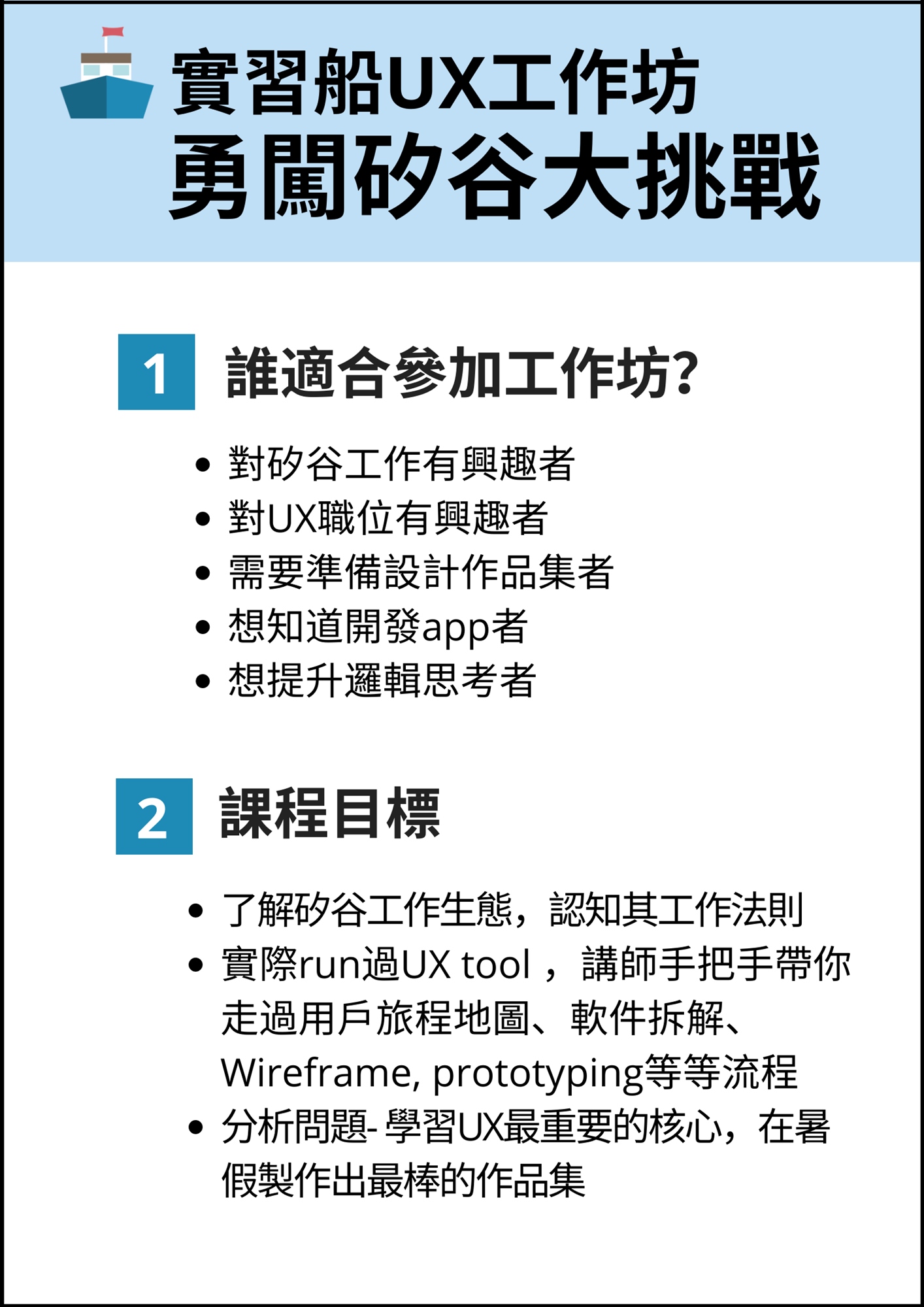 你有沒有發現?現在越來越多公司都開始注重用戶體驗、使用情境,你是否有想過該來了解或學習UX呢?在這次工作坊你將可以學到三大重點