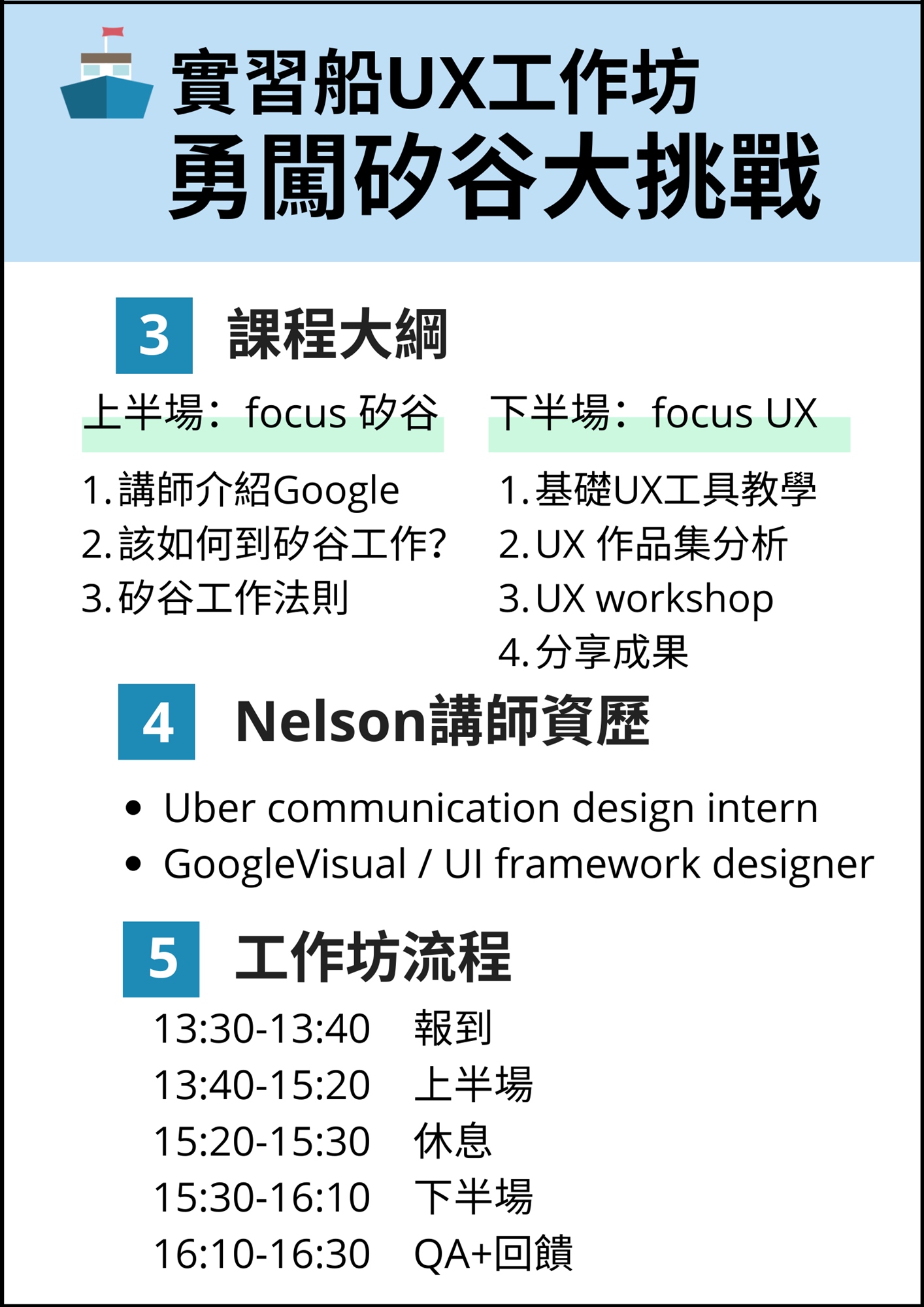 實習船很榮幸的邀請到講師 - Google senior Designer 的 Nelson,在這次的工作坊中,Nelson將會藉由講解作品集,帶領學員們快速跑過UX workshop。