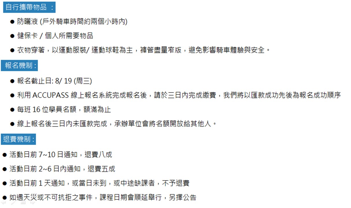 1.單車運動屬風險性之運動,報名者需自行評估參與者的身體健康狀況適合參加戶外運動。