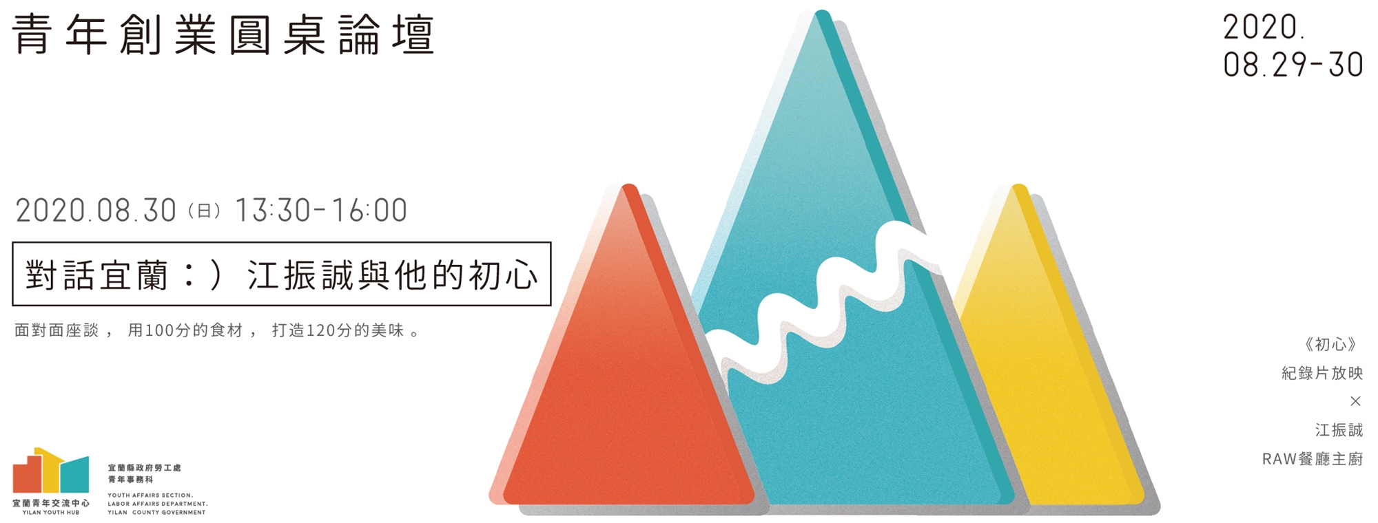 - 「對話宜蘭:江振誠與他的初心」場次限25人參加,採登記抽籤制(登記至8/21 23:59為止),同一店家統一編號限一人報名,以負責人為優先報名。